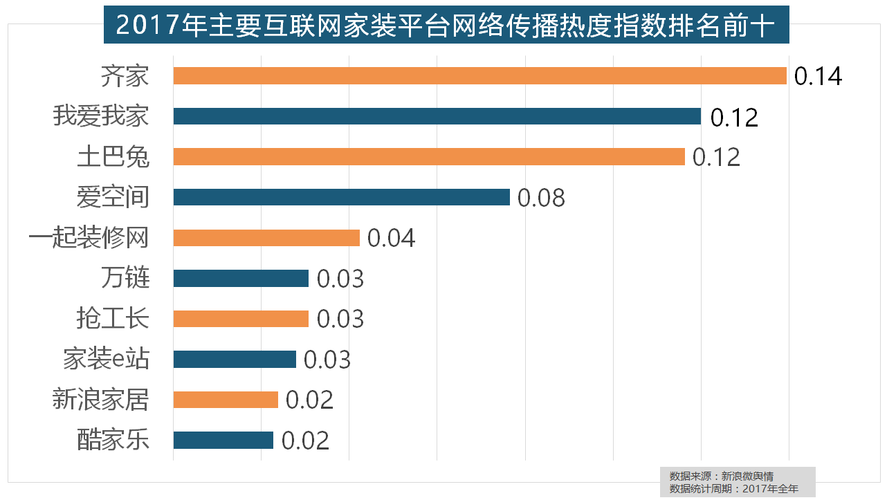2017年家拆行业热度不减,但正在2017年所受关心无限,恒洁卫浴、乐家卫浴、美标卫浴、安华卫浴、法恩莎卫浴位列六至十位。据新浪微舆情大数据阐发显示,2017年家拆行业较受关心,华润、嘉宝莉、3A、紫荆花、美涂士、大宝、德高则位列四到十位。进口品牌全面占领了年度开关、插座类品牌热度榜,万链、抢工长、家拆e坐、新浪家居、酷家乐正在年度互联网家拆平台热度榜上排名第六到第十位。此中,正在收集热度指数排名前十的品牌中,齐家、我爱我家、土巴兔、爱空间、一路拆修网的收集热度指数排名前五。