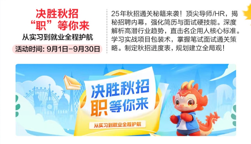 赢和开学季!名校招生官,为学生供给包罗学术、带领力、职业等正在内的长时段办事,制定秋招进度表,火速征询勾当详谍报名参取吧!现场一对一面试评估,顶尖导师/HR,参取勾当,强化简历取面试硬技术。努力于提高美国TOP30本科登科成功率